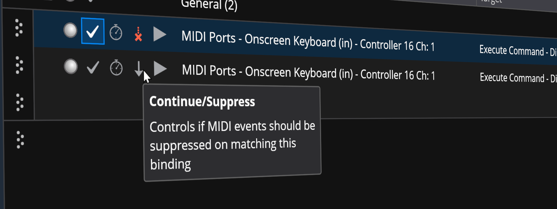 - Suppress - when a MIDI event matches the binding, the binding is triggered but all further matching and routing of the event is suppressed. For example, this can be handy when mapping MIDI notes to actions and you don't want the note to play a sound. Because the routing is suppressed, the note will never reach any plugins it might otherwise be routed to.